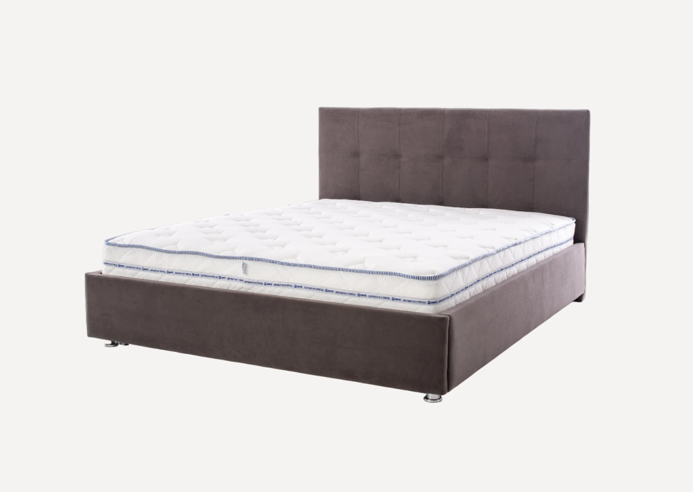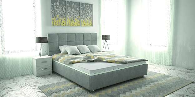 КонструкцияСпинка кровати изготовлена из ДСП толщиной 16 мм, брусков из массива древесины и фанеры толщиной 15 и 9 мм. Для придания мягкости и объема используется настил из поролона толщиной 25 мм, что делает спинку изящной и не громоздкой. Спинка устанавливается на плоские пластиковые подпятники. Царги кровати и ножная спинка изготовлены из ДСП толщиной 16 мм, брусков из массива древесины и фанеры толщиной 9 мм, с настилом из поролона толщиной 10 мм для обеспечения мягкости и объема. Это позволяет царгам выглядеть гармонично по отношению к головной спинке, без излишнего объема. Каркас кровати установлен на хромированные опоры высотой 100 мм, закрепленные внутри каркаса на металлических уголках. Высота царг от пола составляет 350 мм, а матрас утоплен на 50 мм.