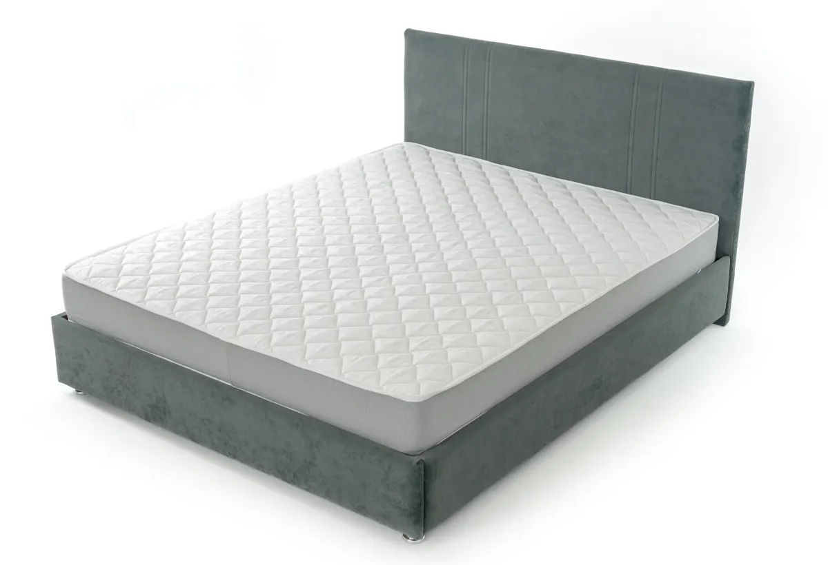 Мягкое, тонкое изголовье украшено двойной деликатной строчкой, царги затянуты основной тканью, каркас кровати установлен на хромированные опоры.